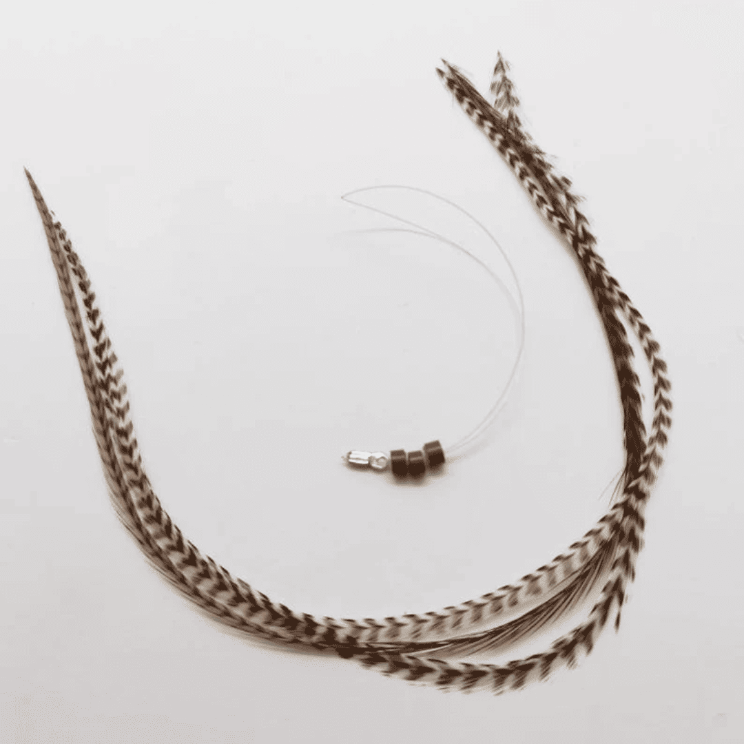 Lot de 3 plumes naturelles de couleur chocolat. Léger, élégant et réutilisable. Comprend des micro-anneaux et un enfileur pour un placement facile dans les cheveux.